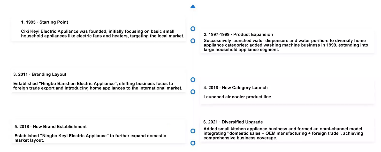 Ningbo Keyi Electric Appliance Co., Ltd ондаған жылдар бойы тұрақты дамуымен келесі жолдан өтті: 1995 жылы Cixi Keyi Electric Appliance құрылды, ол бастапқыда жергілікті нарыққа назар аударды және негізінен электр желдеткіштері мен жылытқыштар сияқты шағын тұрмыстық техникамен айналысады.
